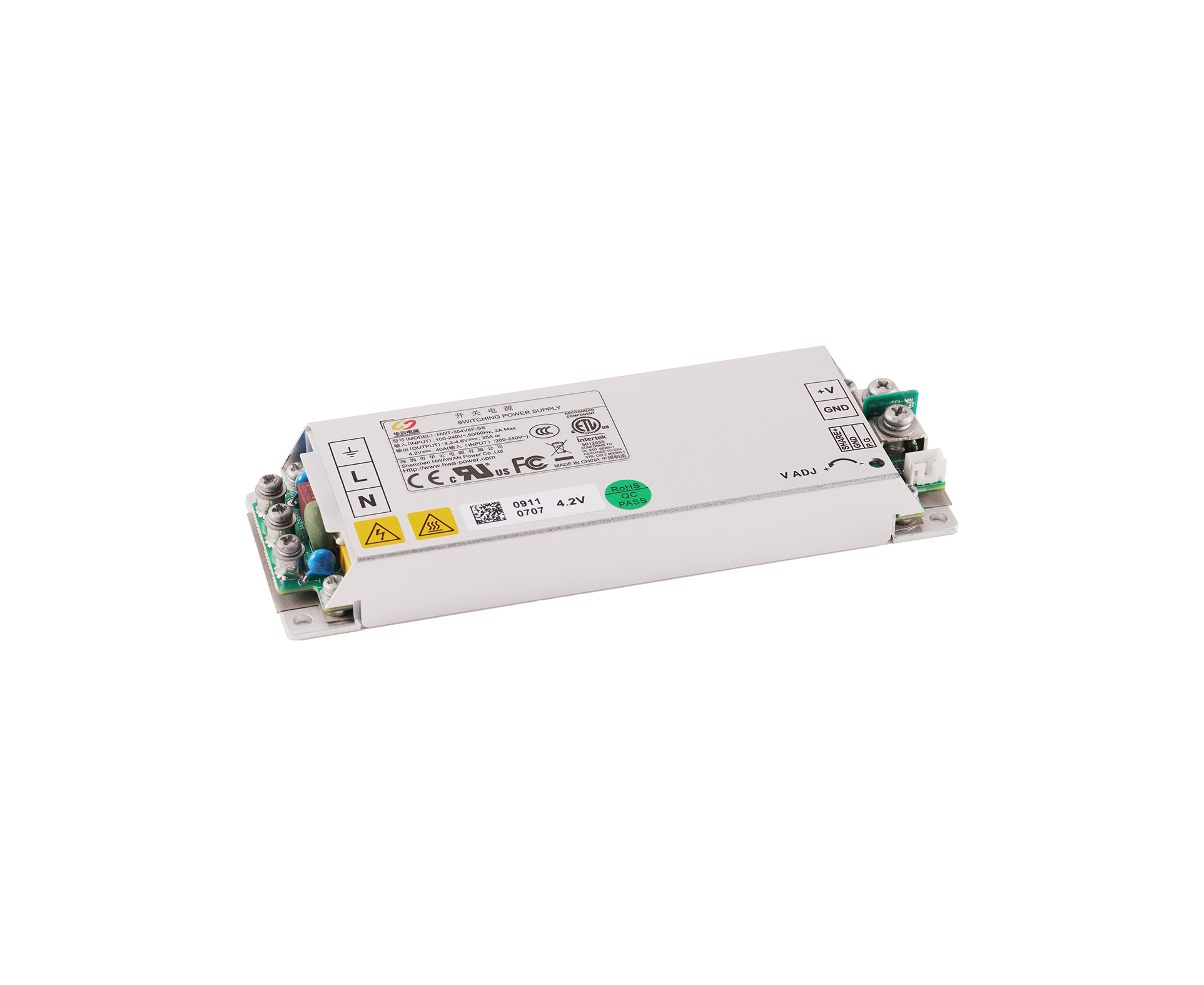 HWT-354V6F-SS 是一款专为 LED 显示屏产品设计的,具有输出均流功能,可以并机使用的 AC/DC 超薄电源产品,额定输出 4.6V/35A。
